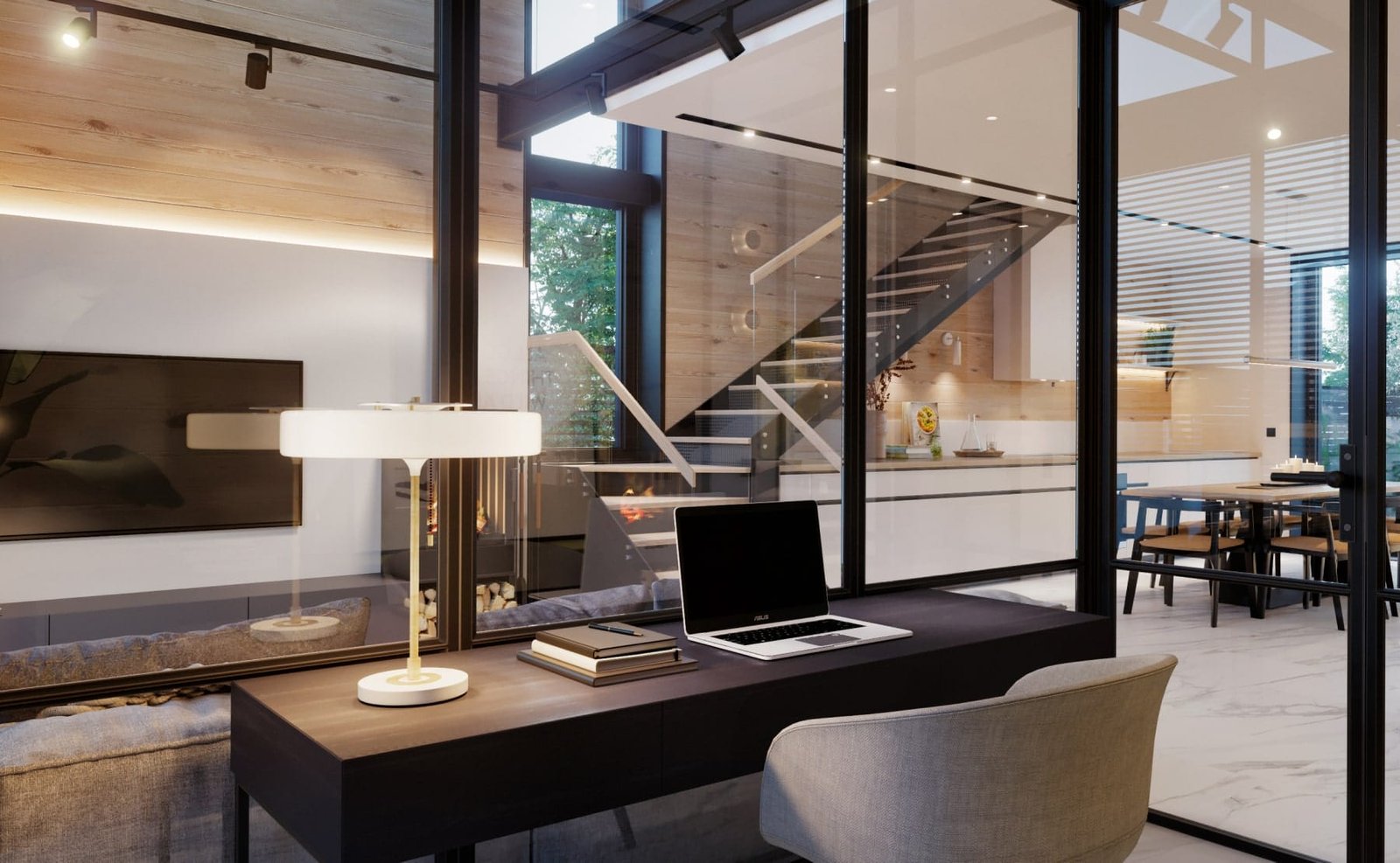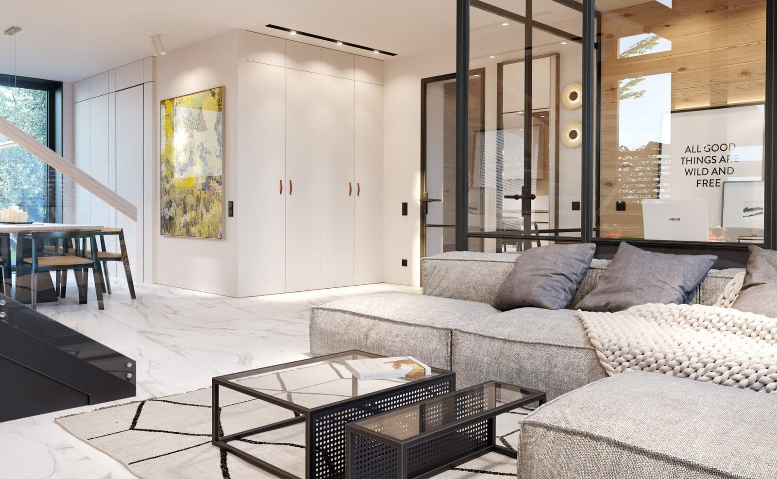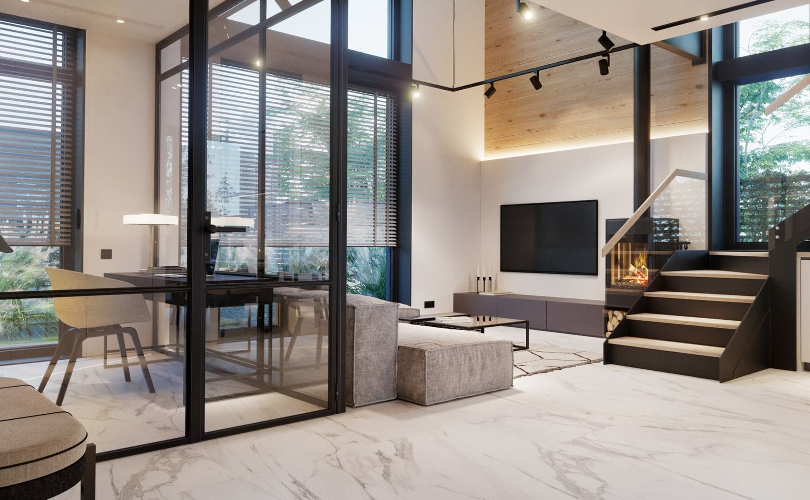 Дизайн інтер'єру будинку виконаний в сучасному стилі. В обробці підлоги і стін застосовуються плитка під мармур, натуральне дерево, метал, скло.