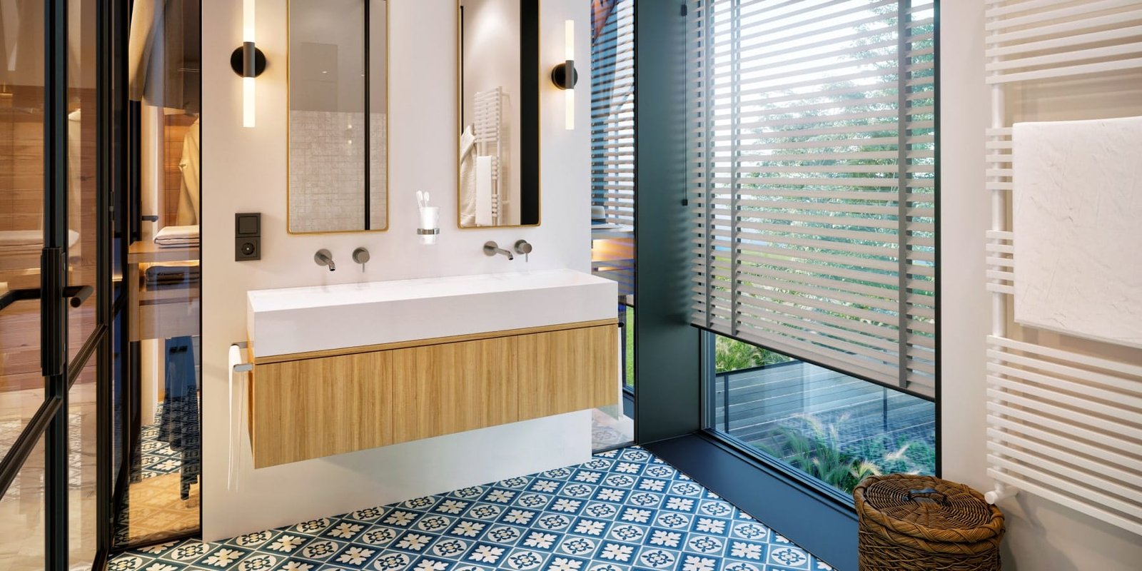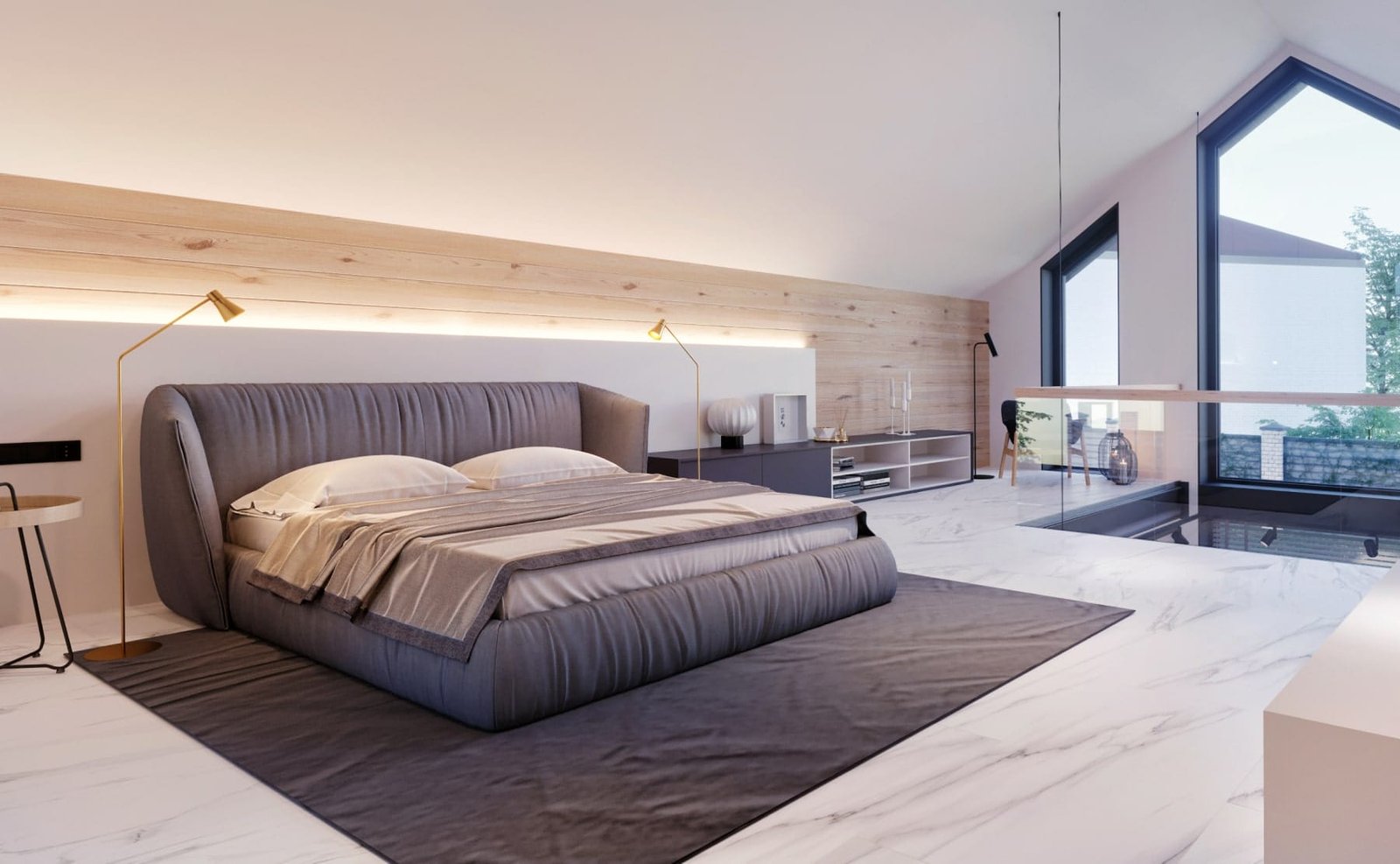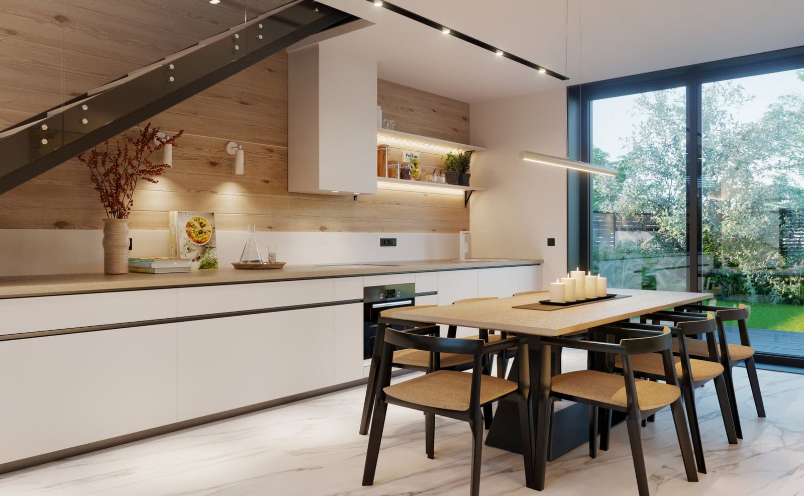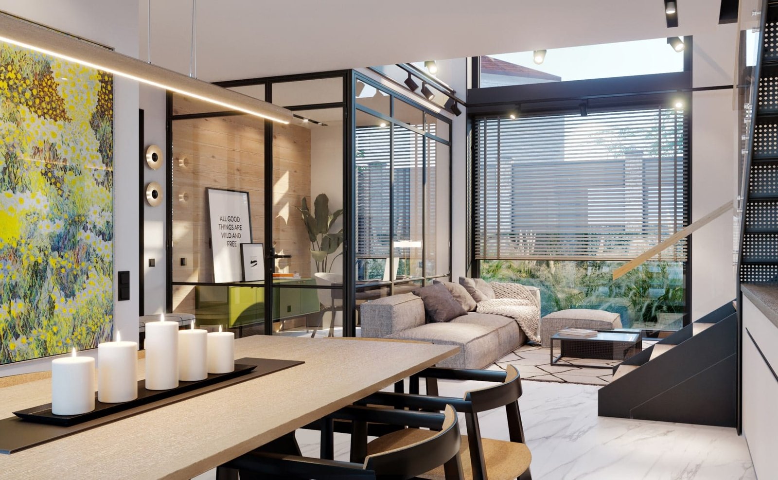 Дизайн інтер'єру будинку виконаний в сучасному стилі. В обробці підлоги і стін застосовуються плитка під мармур, натуральне дерево, метал, скло.