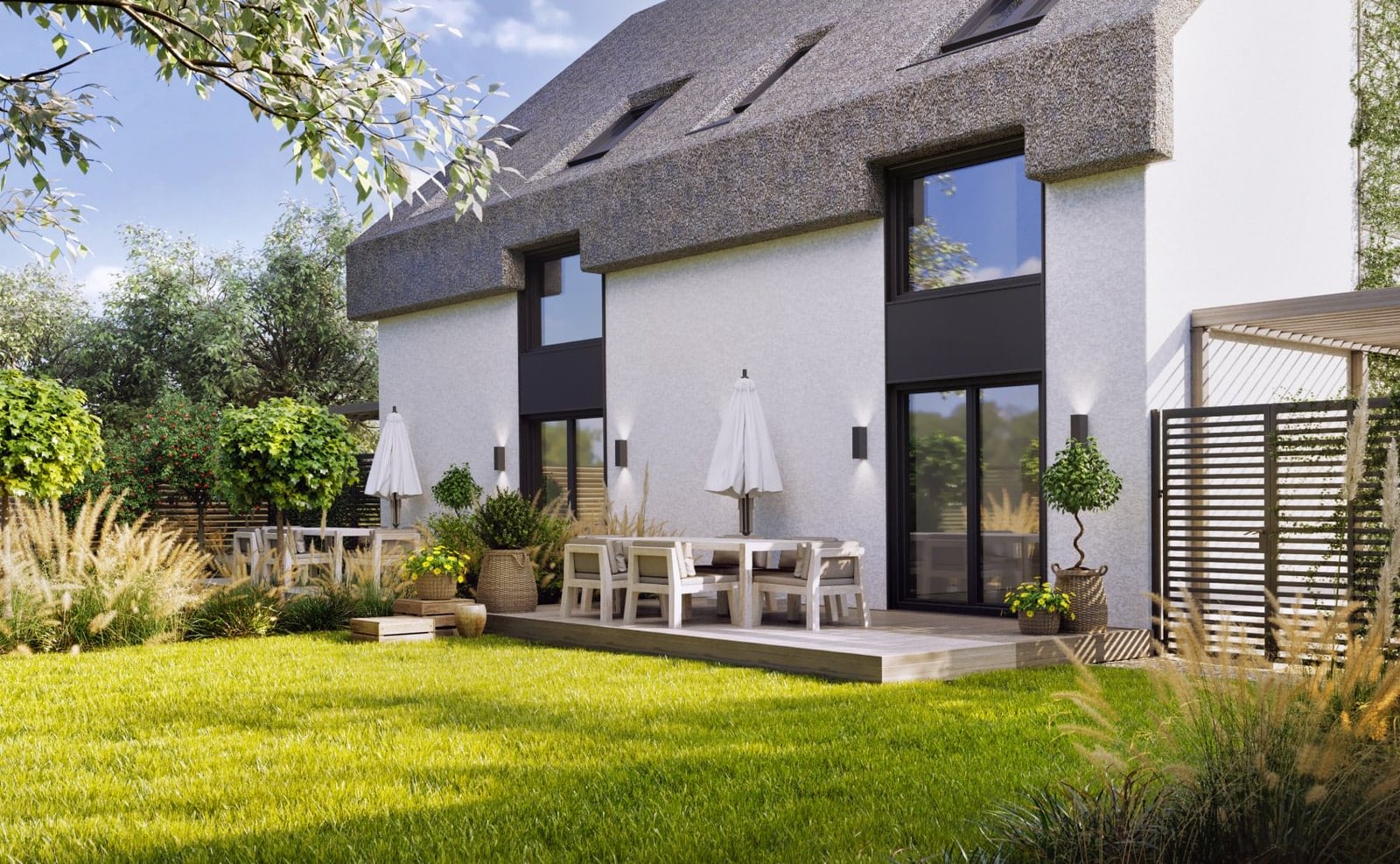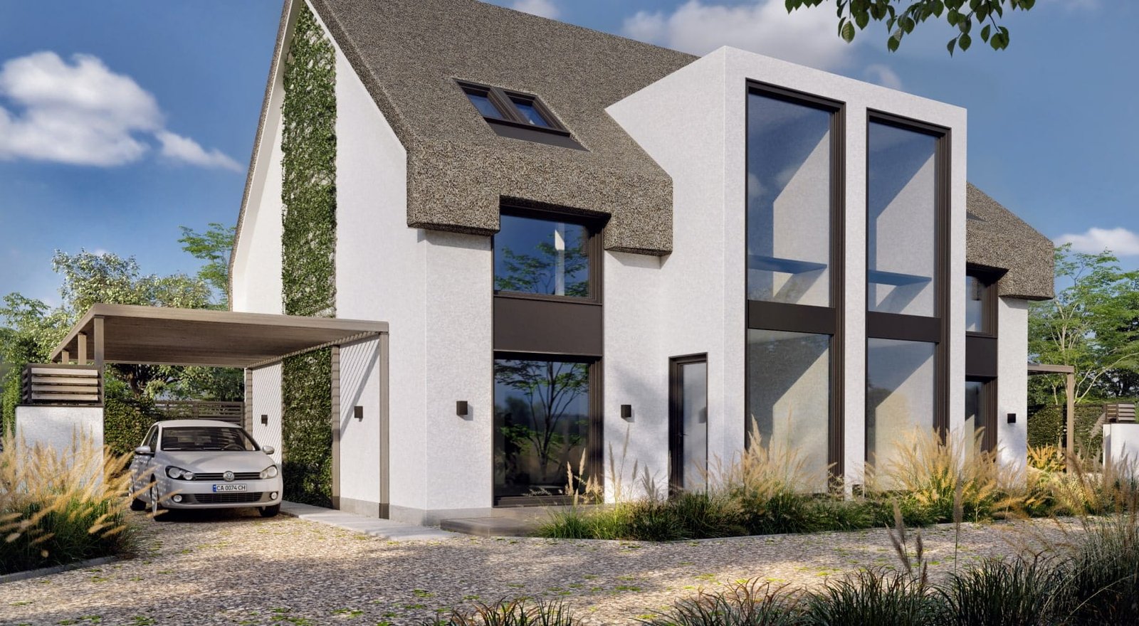 Унікальний проєкт дуплексу, де поєднується об'єднання нових матеріалів і традицій з сучасними архітектурними рішеннями. Для оздоблення даху застосовано традиційний матеріал очерет, який в поєднанні з вертикальними панорамними вікнами надає будинку сучасний вигляд, робить його затишним і комфортним для життя.