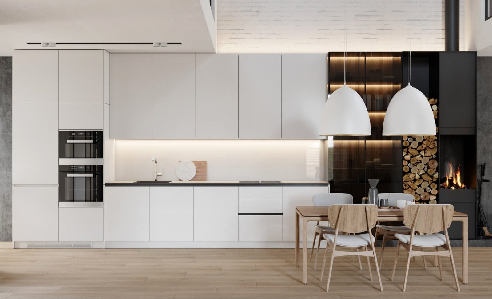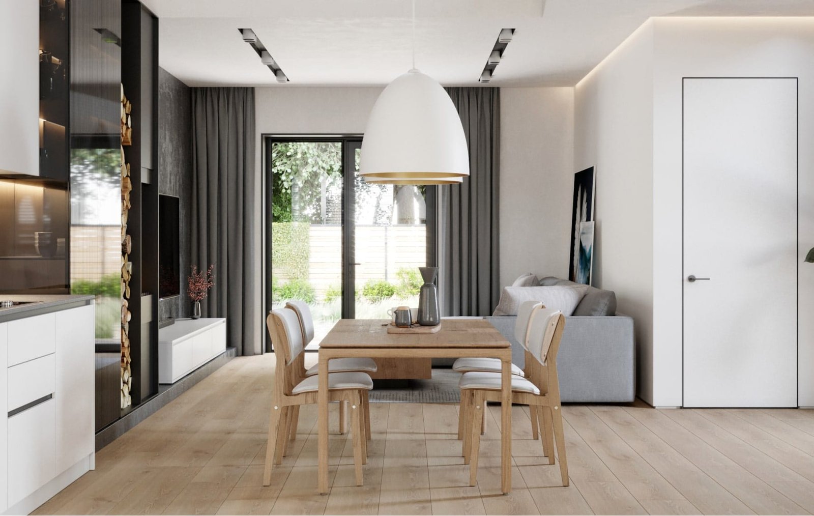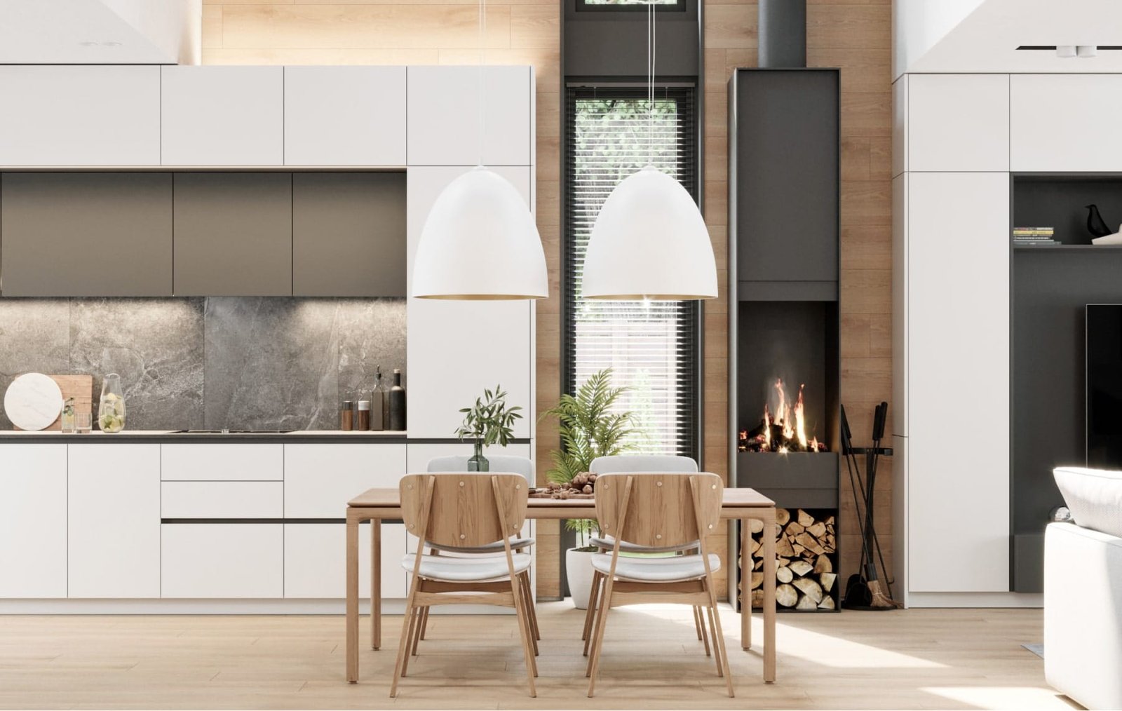 На першому поверсі розташованів велика кухня-їдальня та вітальня, тераса, санвузол, котельня. На другому поверсі розташовані 2 спальні, хазяйська і дитяча, та санвузол з ванною. Стіни з натурального дерева та світлі меблі надають інтер'єру тепла, а велика кількість панорамних і мансардних вікон наповнюють будинок світлом.