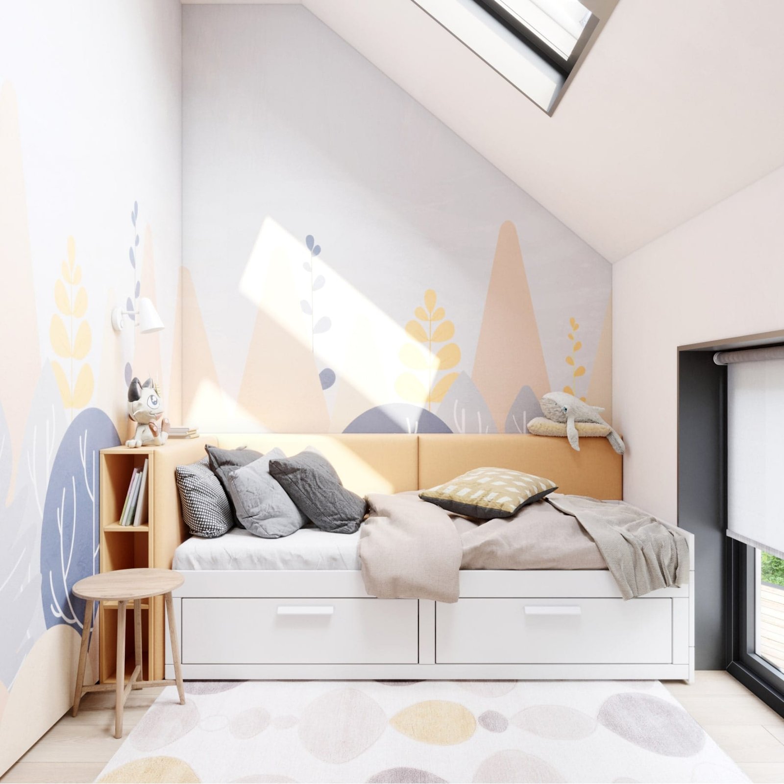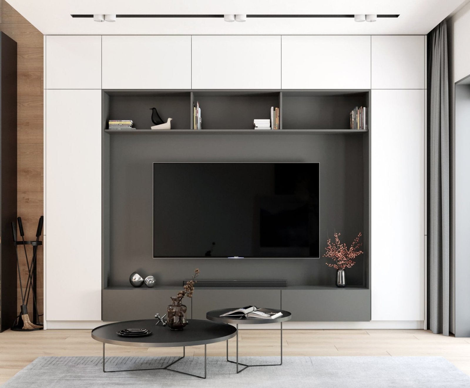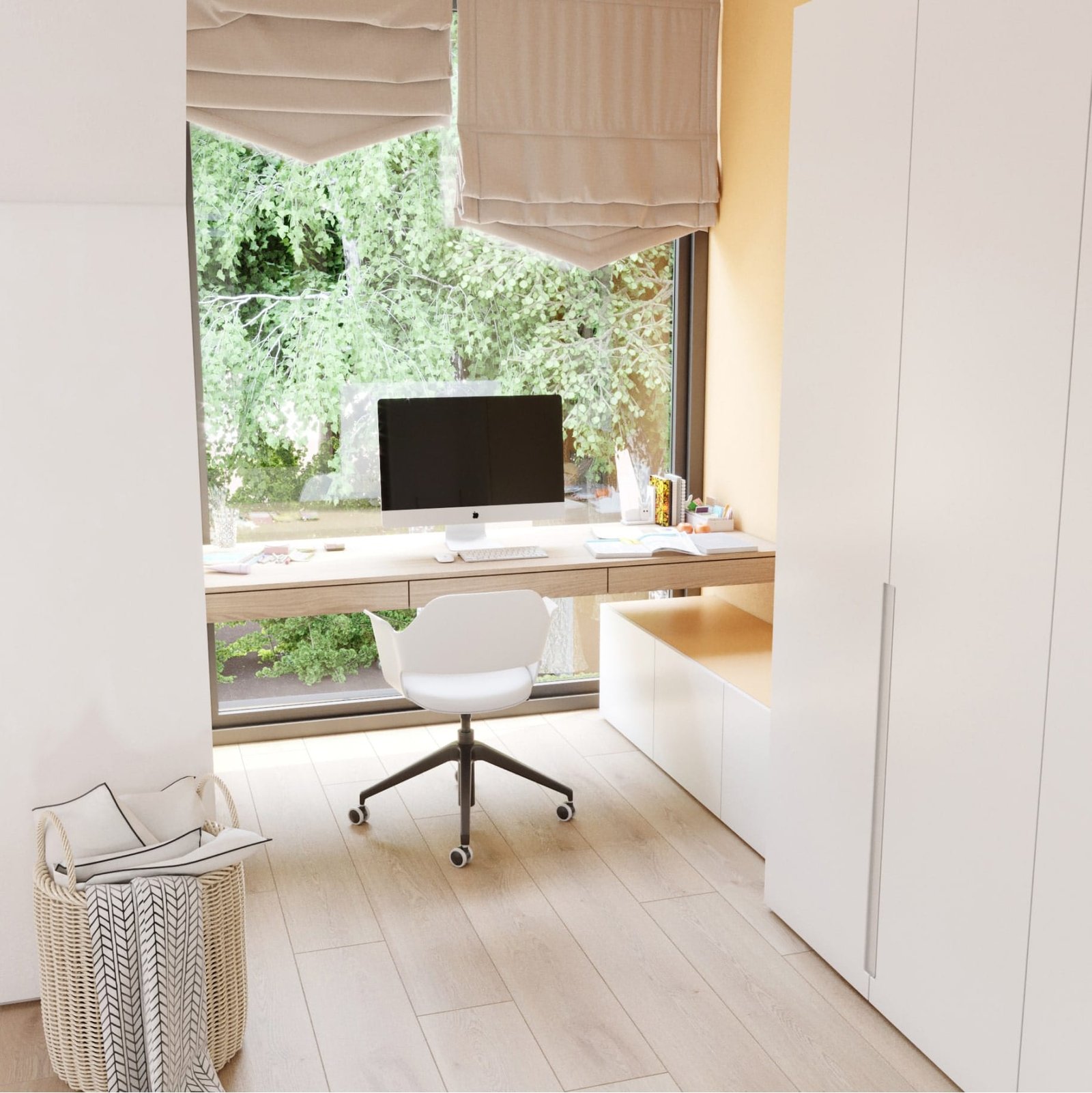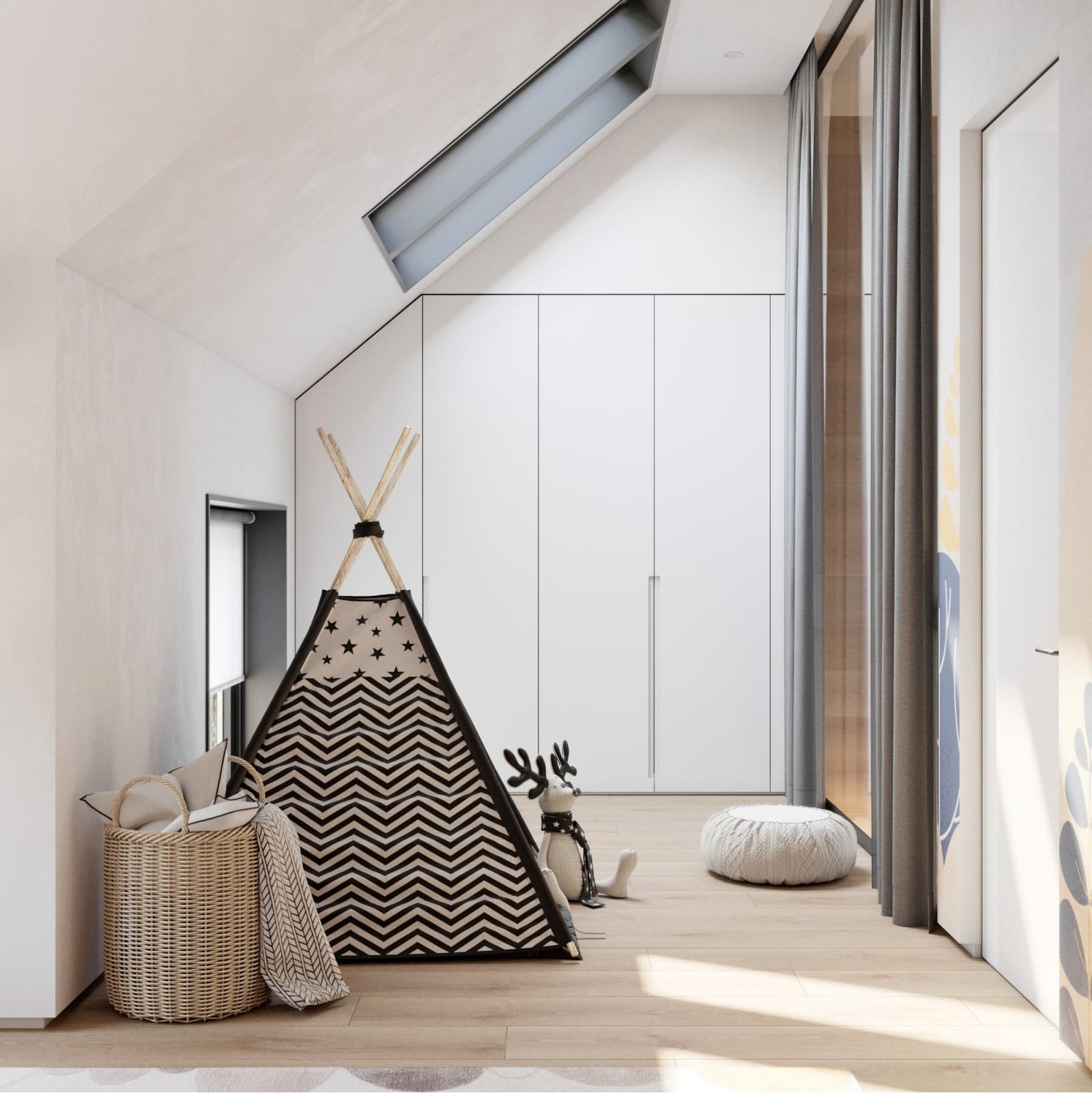 На першому поверсі розташованів велика кухня-їдальня та вітальня, тераса, санвузол, котельня. На другому поверсі розташовані 2 спальні, хазяйська і дитяча, та санвузол з ванною. Стіни з натурального дерева та світлі меблі надають інтер'єру тепла, а велика кількість панорамних і мансардних вікон наповнюють будинок світлом.
