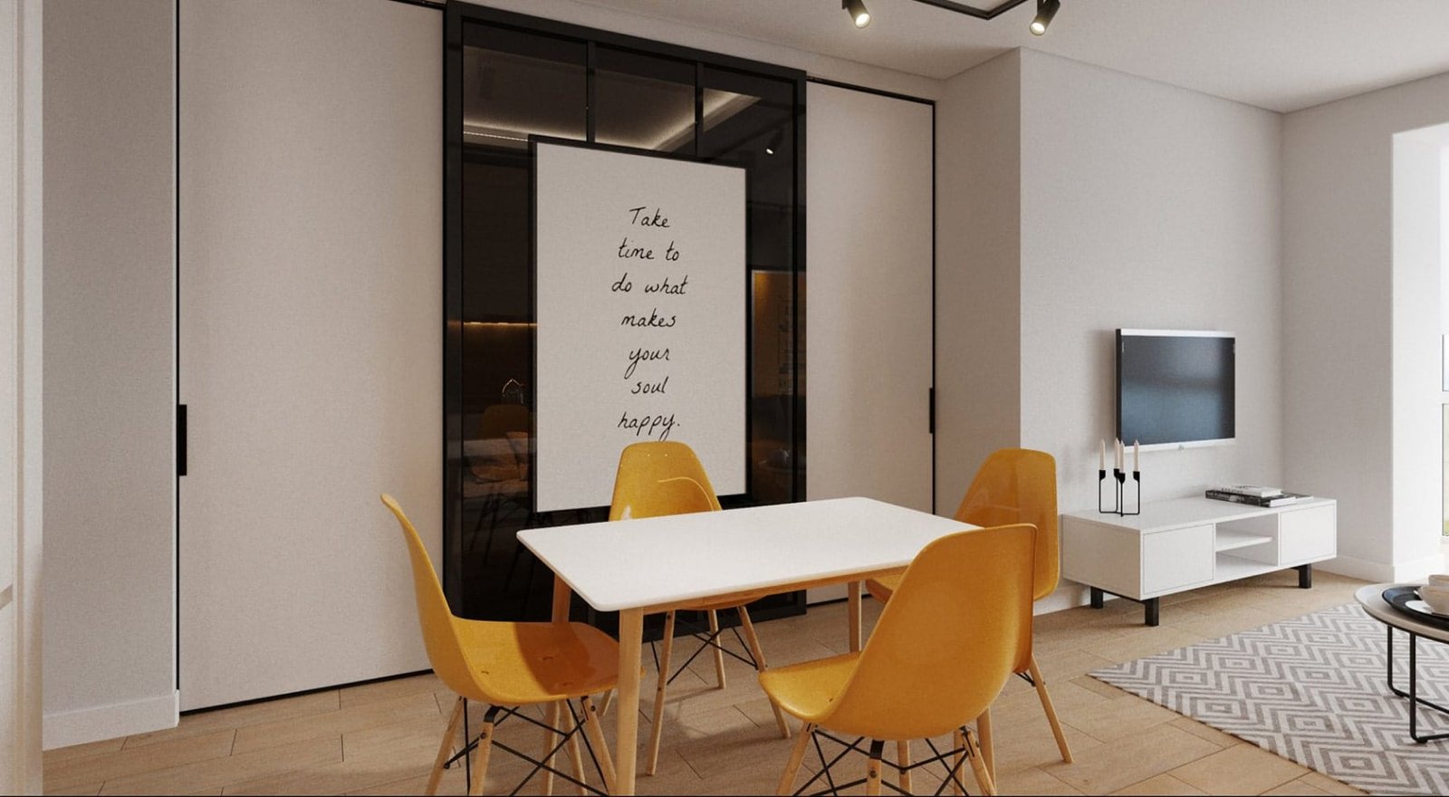 Майже усі стіни цього інтер'єру білі. В цьому рішенні переважає простота і легкість, багато повітря, немає шпалер та складних матеріалів - тільки гра контрасту, рішення кольором та формою конструкції.
