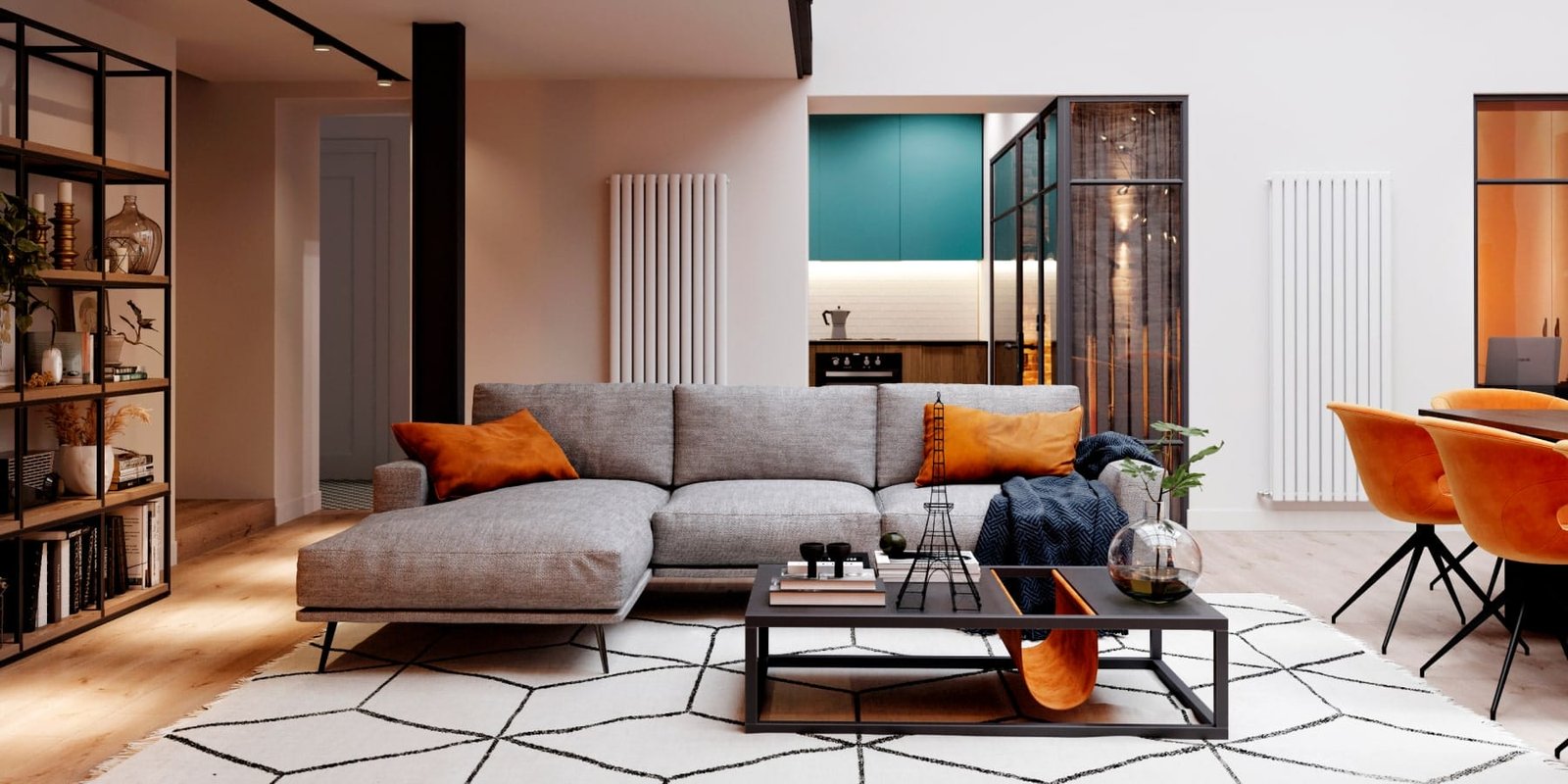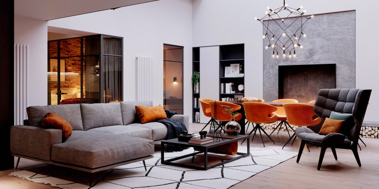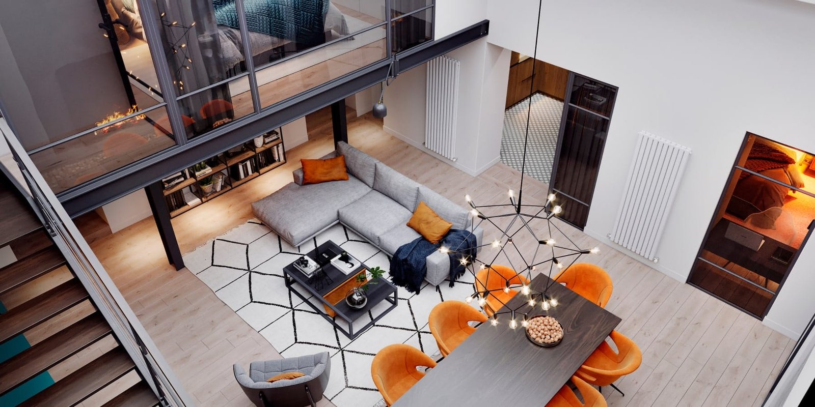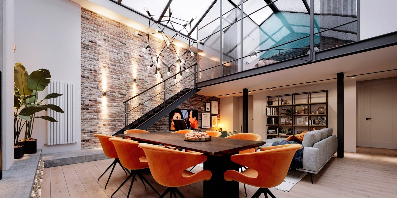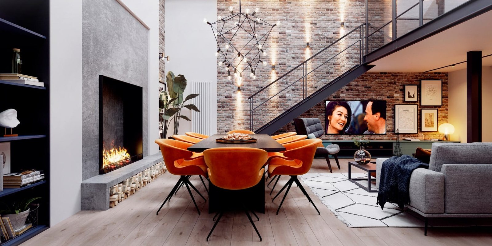 У цей проєкт ми додали відкриті сходи зі скляними перегородками, чим змогли зберегти більше світла у спальних кімнатах. А цегляна кладка на всю стіну з підсвіткою надала інтер'єру тепла і шарму лофту.Квартира складається з передпокою, просторої вітальні з високою заскленою стелею, їдальнею з великим столом, та каміном, який є центром усього простору.