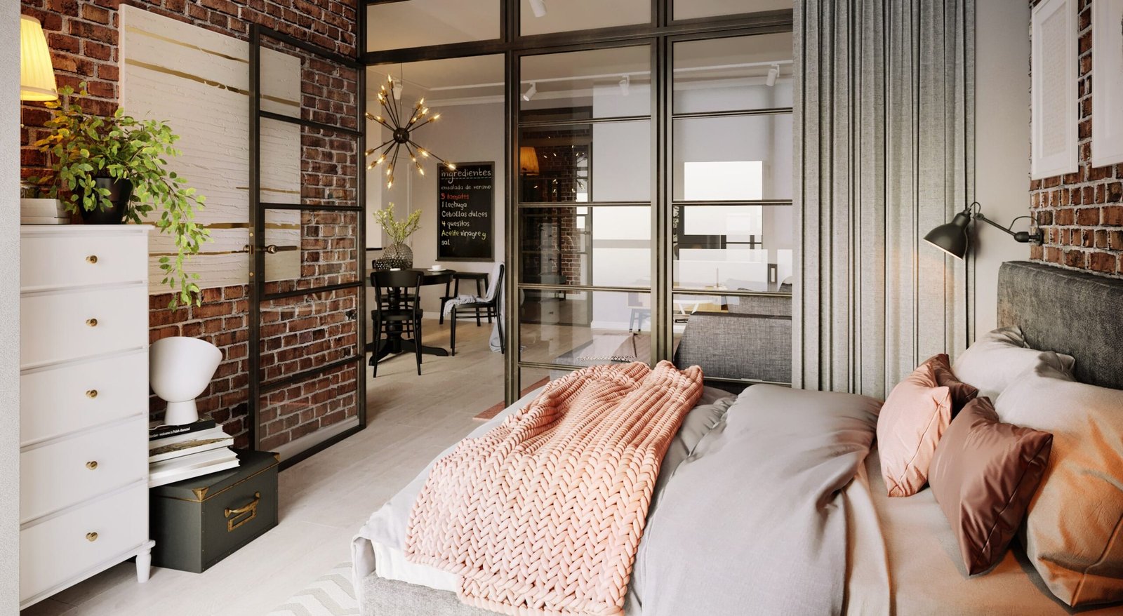 Зона спальні відокремлена легкою скляною перегородкою. Таке рішення створює відчуття повітря у просторі, не закриває потік світла, у той самий час відокремлюючи приватну зону від загальної. При необхідності від вітальні можна закритися шторами блекаут. Фрагмент цегляної стелї додає кімнаті скандинавського характеру.В проєкті були використані декоративні елементи та меблі від IKEA.